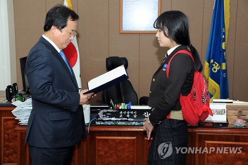 | △ 부산시교육감 표창 받는 '빨간 가방' 여고생 (부산=연합뉴스) 지난 14일 빨간 가방을 메고 음주운전 차량에 치인 버스기사를 도와 화제가 된 부산 성심보건고 2학년 김영희 양이 24일 김석준 부산시교육감 표창을 받고 있다.(부산시교육청 제공) |