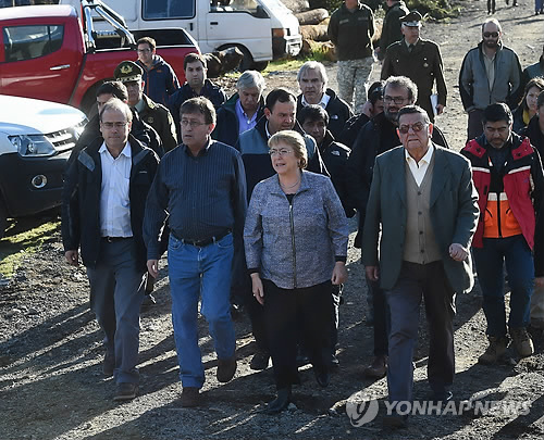 △ 칼부코 화산 인근 지역 방문한 칠레 대통령 (푸에르토몬트<칠레> EPA=연합뉴스) 미첼 바첼레트 칠레 대통령(가운데)이 23일(현지시간) 남부 칼부코 화산이 폭발 조짐을 보임에 따라 비상사태가 선포된 푸에르토몬트 지역을 둘러보고 있다. 수도 산티아고에서 1천300㎞ 떨어진 푸에르토 몬트 시와 푸에르토바라스 시에서는 화산이 내뿜는 화산재와 연기 때문에 학교 수업이 중단됐고 항공기 운항이 금지됐다. 2010596@yna.co.kr