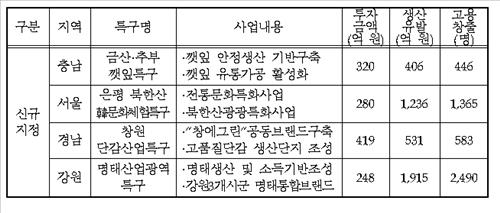 신규 특구 4곳과 투자금액은 ▲ 충남 금산·추부 깻잎특구(320억원) ▲ 서울 은평 북한산 한(韓)문화체험특구(280억원) ▲ 경남 창원 단감산업특구(419억원) ▲ 강원 명태산업광역특구(248억원) 등이다.
