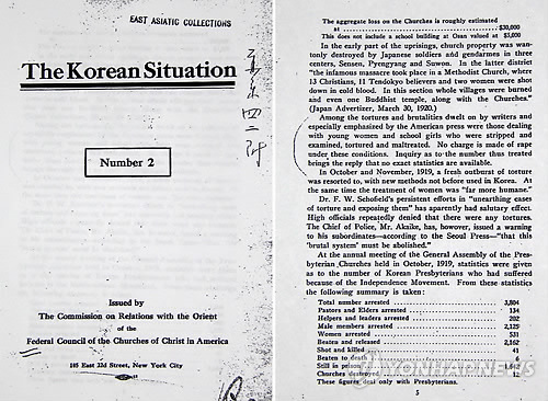 △ 3.1운동 이후 일본경찰 성고문 기술한 미국 문서 (뉴욕=연합뉴스) 박성제 특파원 = 3·1운동 이후에 일본 제국주의 경찰들이 당시 한국(조선) 여학생들을 대상으로 성고문까지 했다는 사실을 기록한 미국 교회연합회(Federal Council of the Churches of Christ in America)의 문서가 미국 뉴욕 맨해튼의 뉴욕한인교회에서 발견됐다. 한국에서 진행된 독립운동 현황과 일본의 대응, 외국에서의 독립운동 등을 기술하고 있는 이 문서에는 일본 경찰이 한국의 젊은 여성과 여학생들을 심문하면서 옷을 벗기고 고문했다는 기록을 담고 있다. 사진 왼쪽은 문서 표지, 오른쪽은 해당 내용이 기술된 페이지.