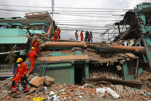 △ 印 재난구호팀, 네팔 대지진 구조 현장 투입 (카트만두 AP=연합뉴스) 인도의 재난구호팀이 대지진 참사가 발생한 네팔 카트만두에 도착, 26일(현지시간) 건물 붕괴 현장에서 생존자 수색작업을 펴고 있다.
