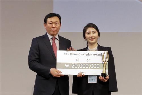 27일 롯데그룹에 따르면 신 회장은 이날 오전 서울 잠실 롯데호텔에서 열린 '2015 롯데 HR(인사관리) 포럼'에서 세븐일레븐 음료주류팀 소속 상품기획자(MD) 장채윤(여·29) 대리에게 '벨류 챔피언 어워드' 대상을 수여했다.