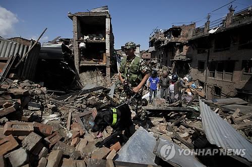 | △ (카트만두 AP=연합뉴스) 이틀전 대지진이 강타한 네팔 수도 카트만두 교외 박타푸르에서 27일(현지시간) 구조대원이 탐지견과 함께 폐허 더미 사이를 살피며 지나고 있다. 지난 25일 발생한 지진으로 인한 사망자가 3천600명을 넘어선 가운데 카트만두와 인구 밀집지역인 주변 카트만두 계곡 주민 수만명이 집을 잃고 노숙자가 됐다. |
