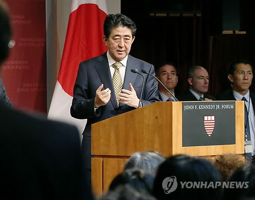 △ 하버드대서 강연하는 아베 총리 (케임브리지<미국 매사추세츠> 교도=연합뉴스) 아베 신조(安倍晋三) 일본 총리가 27일(현지시간) 미국 하버드대에서 강연하며 학생의 질의에 응하고 있다 . sewonlee@yna.co.kr
