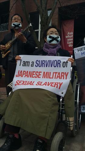 '침묵의 마스크'를 쓴 이 할머니는 불편한 몸에도 휠체어에 앉아 '나는 일본군 성노예의 생존자다'라는 글귀가 적힌 플래카드를 들고 아베 총리의 위안부 강제동원 부정을 규탄했다.