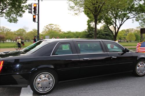 △ 아베 신조 일본 총리가 27일(현지시간) 오후 과거사에 대한 사과 없이 워싱턴DC의 홀로코스트 박물관을 방문한 뒤 건물을 빠져나가고 있다. 뒷자리에 탄 아베 총리의 오른쪽 얼굴 옆모습 일부가 카메라에 잡혔다. 2015.4.28