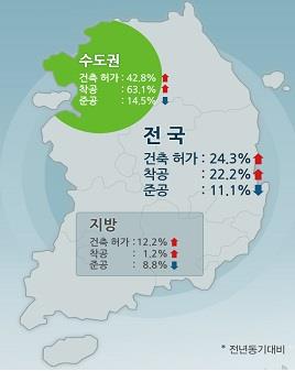 28일 국토교통부의 2015년 1분기 건축 인허가 현황에 따르면 지역별 허가면적은 수도권 1천551만㎡로 지난해 같은 기간보다 42.8% 증가했고 지방은 1천848만8천㎡로 12.2% 증가했다.