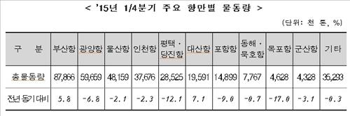 작년 1분기 대비 품목별로는 자동차 13.7%, 목재 31.4%, 화공품 9.0% 증가한 반면, 철재 13.1%, 시멘트 7.15, 모래 6.5% 등 조선·건설관련 원자재 물동량이 줄었다.