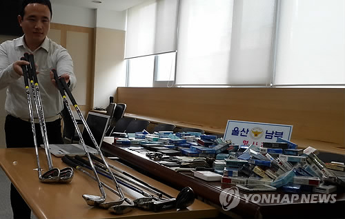 | △ 청소년들이 훔친 차 타고 절도 행각 (울산=연합뉴스) 허광무 기자 = 울산 남부경찰서는 차를 훔쳐 타고 다니며 상가 등에서 절도 행각을 벌인 박모(16)군 등 청소년 21명을 검거했다. 28일 남부경찰서에서 열린 브리핑에서 형사가 골프채, 노트북, 담배 등 증거품을 보여주고 있다. 2015.4.28 hkm@yna.co.kr |