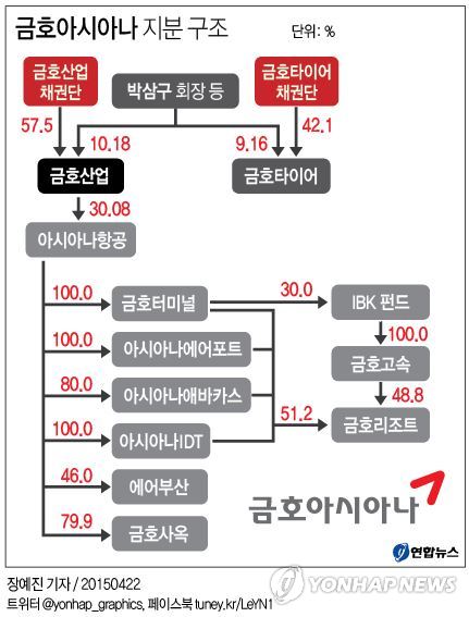 금호산업은 아시아나항공[020560]의 최대주주(30.08%)이고, 아시아나항공은 금호터미널·아시아나에어포트·아시아나IDT 주식 100%를 보유하는 등 금호아시아나그룹 전체 지배구조가 맞물려 있어 박 회장으로서는 사활을 걸 수밖에 없다.