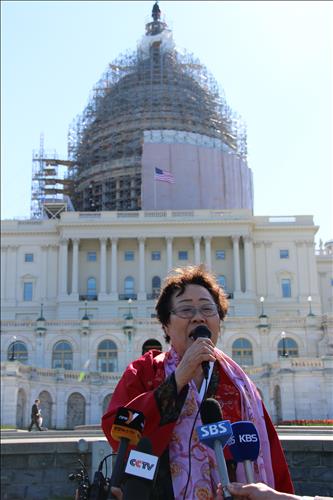 | △ 일본군 위안부 피해자 이용수 할머니가 28일(현지시간) 미 의사당 앞에서 워싱턴DC의 한미중 시민단체들과 연대집회를 갖고 아베 총리의 과거사 왜곡 및 부정을 규탄하면서 위안부 강제동원에 대한 사과 및 배상을 요구하고 있다. |