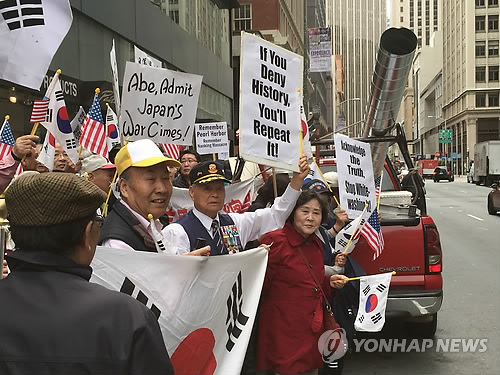 △ 아베 방미 맞아 샌프란서 일본 역사왜곡 항의 시위 (샌프란시스코=연합뉴스) 임화섭 특파원 = 아베 신조(安倍晋三) 일본 총리가 미국을 방문중인 가운데 28일(현지시간) 낮 미국 샌프란시스코 도심의 일본 영사관 앞에서 중국계·한국계 시민 300여명이 아베 총리의 과거사 부정을 규탄하는 시위를 벌이고 있다. 2015.4.29 solatido@yna.co.kr