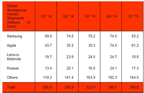 애플은 아이폰6와 아이폰6플러스가 중화권을 중심으로 전 세계적으로 인기를 끌며 1분기 판매가 15% 늘어났으나 삼성전자의 판매량을 따라잡지는 못했다.