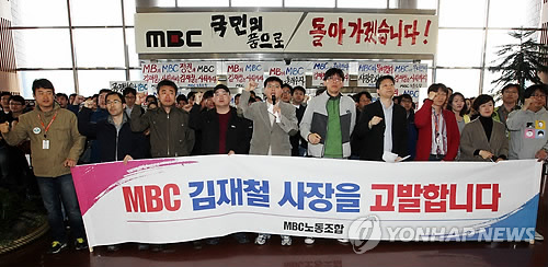 △ MBC 노동조합이 2012년 4월 17일 서울 여의도 MBC에서 기자회견을 열고 구호를 외치고 있다.