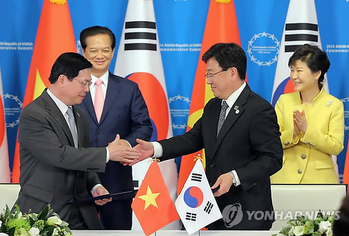 △ <한-아세안>한-베트남FTA, 28개월만에 타결 (부산=연합뉴스) 이정훈 기자 = 윤상직 산업통상자원부 장관과 부휘황 베트남 산업무역부 장관이10일 오후 부산 해운대구 한 호텔에서 박근혜 대통령과 응웬 떤 중 베트남 총리의 공동 기자회견에 앞서 양국 FTA 실질 타결 합의 의사록에 서명한 뒤 악수하고 있다. 2014.12.10 uwg806@yna.co.kr