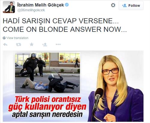 이 사진에는 '터키 경찰이 부적절한 폭력을 사용했다고 비난한 멍청한 금발은 어디에 있나'라는 뜻의 터키어 문장이 적혀 있었다.