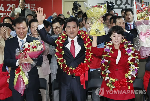 | △ 환호하는 오신환 후보 (서울=연합뉴스) 이상학 기자 = 4.29 재보궐선거 관악을에 출마한 오신환 새누리당 후보가 29일 오후 당선이 확실해지자 관악구 선거사무소에서 지지자들과 함께 환호하고 있다. |