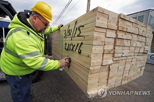 | △ (피츠버그<미 펜실베이니아주> AP=연합뉴스) 지난달 31일 미국 펜실베이니아 주 피츠버그의 한 목재 공장에서 노동자가 출하될 목재에 생산정보를 표시하고 있다. 미국 상무부는 지난 1분기 국내총생산(GDP) 성장률이 0.2%라고 발표했다. 이는 1%였던 전문가들의 예상치에 크게 뒤지는 값이다. |