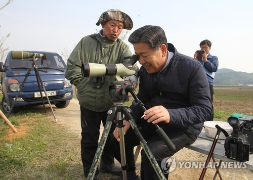 △ 황새 관찰하는 진천군수 (진천=연합뉴스) 변우열 기자 = 유영훈 충북 진천군수가 진천군 진천읍 백곡천에서 '새 박사' 윤무부 경희대 명예교수와 함께 황새를 관찰하고 있다. 이곳에는 지난해 4월 한국교원대 황새공원을 탈출한 황새 '미호'와 시베리아에서 월동을 위해 국내에서 날아들었다가 철새 무리에서 떨어져 나온 황새 1마리가 서식하고 있다. 2015.4.24 << 진천군 제공 >><<연합뉴스 DB>> bwy@yna.co.kr