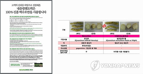 | △ "가짜" vs "진짜"…백수오 진실공방 (서울=연합뉴스) '가짜 백수오' 논란을 둘러싸고 한국소비자원과 백수오 원료 공급 업체인 내츄럴엔도텍 간의 진실공방이 수그러들지 않고 있다. 앞서 소비자원은 내츄럴엔도텍이 식용이 금지된 이엽우피소를 사용했다고 밝혔고, 가짜 백수오 논란에 주가 폭락이라는 직격탄을 맞은 내츄럴엔도텍은 소비자원의 검사 방식에 문제를 제기하며 정면으로 맞선 형국이다. 왼쪽은 27일 종합 일간지에 실린 내츄럴엔도텍의 전면광고, 오른쪽은 한국소비자원에서 배포한 백수오와 이엽우피소를 비교한 자료. 2015.4.27 photo@yna.co.kr |