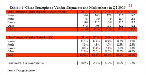 미국 시장조사기관 스트래티지 애널리틱스(SA)는 올 1분기 중국 스마트폰 시장에서 샤오미가 1천400만대를 팔아 12.8%의 점유율로 1위에 올랐다고 30일 밝혔다.