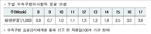 질병관리본부는 의료기관 100곳이 참여하는 수족구병 표본감시체계를 통해 외래환자 1천명당 수족구병 의사환자 수인 '수족구병 의사환자 분율'을 매주 집계하고 있다.