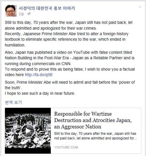 한국 홍보 전문가인 서경덕 성신여대 교수는 지난 24일 외무성 제작 동영상을 반박하는 '전쟁 당시 국가 파괴 : 책임져야 할 파트너로서의 일본'이라는 영상을 유튜브(http://fa.do/q9B)에 공개한 데 이어 30일 페이스북에 광고를 올렸다.