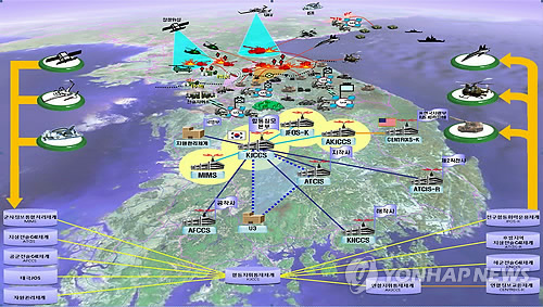 | △ 한국군 정보유통장비 '합동지휘통제체계' 개량완료 (서울=연합뉴스) 합동참모본부가 육·해·공군, 해병대, 한미연합사령부 등과 각종 군사 및 전술정보를 유통하는 데 이용하는 '합동지휘통제체계'(KJCCS)의 성능이 성공적으로 개량되어 전투용 적합 판정을 받았다고 방위사업청이 1일 밝혔다. 사진은 합동지휘통제체계 운영개념도. (방사청 제공) |