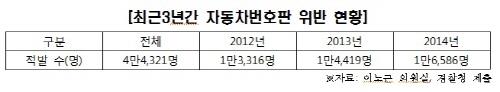 1일 국회 국토교통위원회 소속 이노근 의원이 경찰청에서 제출받은 자료에 따르면 자동차번호판 위반 혐의로 적발된 인원은 2012년 1만3천316명, 2013년 1만4천419명, 2014년 1만6천586명으로 계속 늘고 있다.
