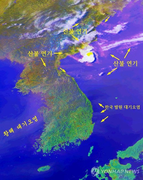| △ 고려대기환경연이 확보한 한반도 위성사진 (청주=연합뉴스) 27일 청주시 고려대기환경연구소는 지난 26일 NOAA(미국해양대기청) 위성이 촬영한 한반도 위성사진을 공개했다. 연구소는 북한에서 40곳의 산불이 발생, 연기가 높새바람을 타고 동해로 이동하고 있다고 사진을 분석했다. 2015.4.27 <<고려대기환경연구소 제공>> vodcast@yna.co.kr |