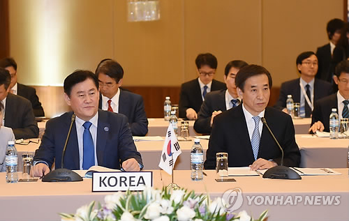 | △ 한.중.일 재무장관회의 (서울=연합뉴스) 최경환 부총리 겸 기획재정부 장관이 이주열 한국은행 총재와 함께 3일 오전(현지시간) 아제르바이젠 바쿠 힐튼호텔에서 열린 한.중.일 재무장관회의에 참석하고 있다. (기획재정부 제공) |