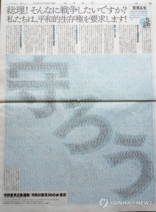 개헌에 반대하는 시민단체는 3일 자 요미우리(讀賣)신문과 마이니치(每日)신문 등에 '총리! 그렇게 전쟁을 하고 싶습니까? 우리는 평화적인 생존권을 요구합니다!"는 문구를 담은 전면 의견 광고를 찬성자의 이름과 함께 실어 눈길을 끌었다.