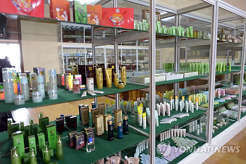 | △ 북한 평양화장품공장 (평양 조선중앙통신=연합뉴스) 북한 김정은 국방위원회 제1위원장이 평양화장품공장을 시찰했다고 조선중앙통신이 5일 보도했다. 사진은 평양화장품공장에 진열된 화장품. 2015.2.5 photo@yna.co.kr |