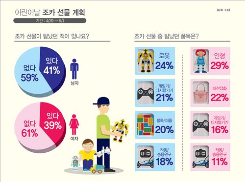 큐레이션 커머스 G9(www.g9.co.kr)은 어린이날을 앞두고 최근 삼촌·이모·고모 524명을 대상으로 설문조사를 한 결과 '조카에게 주려고 산 선물이지만 내가 갖고 싶은 적이 있었다'는 응답자는 41%에 이르렀다고 4일 밝혔다.