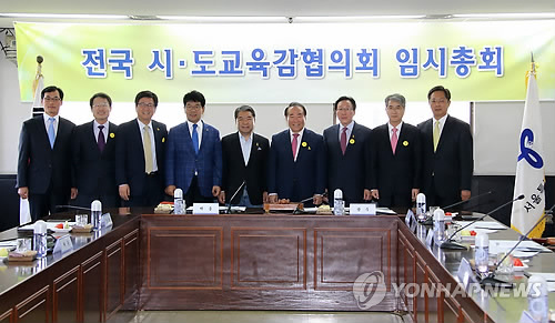 | △ 전국 시·도교육감협의회 임시총회 (서울=연합뉴스) 이정훈 기자 = 4일 오후 서울 종로구 신문로2가 서울시교육청에서 열린 전국 시·도교육감협의회 임시총회에 앞서 전국 시·도교육감들이 기념촬영을 하고 있다. |