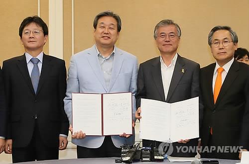 | △ 새누리당 유승민 원내대표(왼쪽부터), 김무성 대표, 새정치민주연합 문재인 대표, 우윤근 원내대표가 지난 2일 국회에서 '공무원연금 개혁 및 국민연금 강화를 위한 양당 대표 합의문'을 발표하고 있다. |