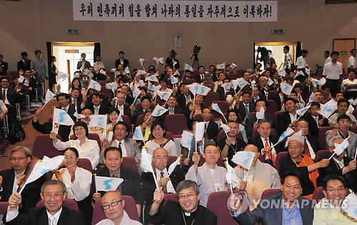 | △ 정부, 6·15 남북공동행사 사전접촉 승인 (서울=연합뉴스) 정부가 4일 6·15 공동선언 발표 15주년 공동행사를 위한 남북 사전 접촉을 승인하기로 했다. 만약 올해 공동 행사가 열리면 지난 2008년 6월 이후 7년 만에 열리는 것이다. 사진은 2008년 금강산에서 열린 6.15남북공동선언 8주년 기념 민족통일대회. (연합뉴스 자료사진) |
