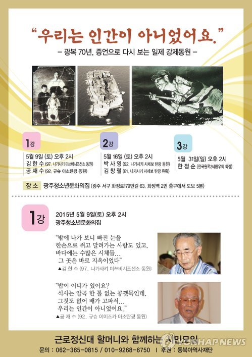 근로정신대 시민모임은 이달부터 8월까지 광주에서 ▲ 강제 징용 ▲ 원폭피해자 ▲ 근로정신대 ▲ 우키시마호 폭침 사건 등 일제 강제동원의 실태를 증언하기로 했다.