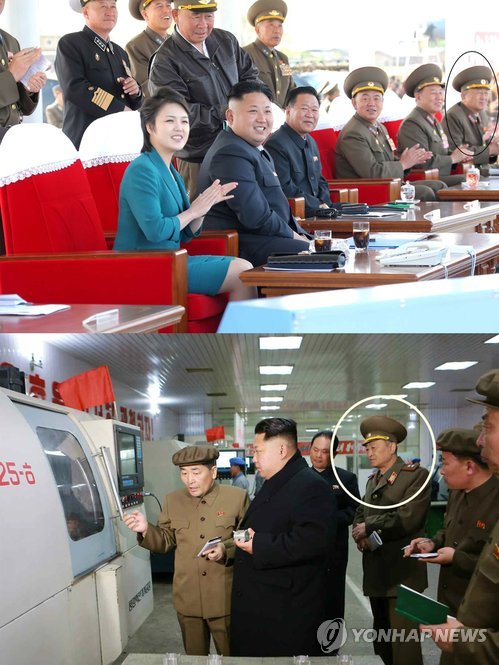 | △ 위의 사진은 윤동현 인민무력부 부부장(흰색 원)이 지난해 5월 10일 김정은 국방위원회 제1위원장 부부의 전투비행기술 경기대회를 관람을 수행했을 당시 중장(별 2개)에서 상장(별 3개)으로 승진한 것이 확인된 모습이다. 아래 사진은 조선중앙TV가 지난달 9일 보도한 것으로 김 제1위원장의 평양약전(弱電)기계공장 시찰 당시 윤 부부장(흰색 원)이 중장 군복을 입고 수행하는 모습이다. 윤 부부장은 이로써 1년만에 다시 중장으로 복귀하게 됐다. 2015.5.5. |