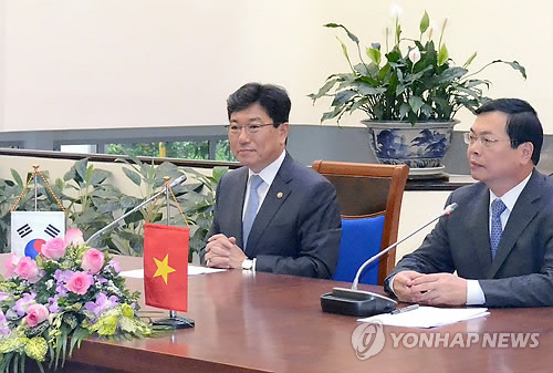 | △ 한·베트남 FTA 정식 서명 (서울=연합뉴스) 윤상직 산업통상자원부 장관(왼쪽)과 부 휘 황 베트남 산업무역부 장관이 5일 베트남 수도 하노이에서 한·베트남 자유무역협정(FTA)에 정식 서명할 준비를 하고 있다. 2015.5.5 << 산업통상자원부 제공 >> photo@yna.co.kr |