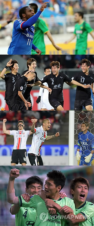 | △ AFC축구, K리그 4개 팀 5년 만에 동반 16강 진출 (서울=연합뉴스) K리그 4개 팀이 2015 아시아축구연맹(AFC) 챔피언스리그 조별리그를 모두 통과했다. 사진은 조별리그를 통과한 수원삼성(위쪽부터), 성남FC, FC서울, 전북현대 선수들이 환호하는 모습. 2015.5.6 << 연합뉴스 DB >> jjaeck9@yna.co.kr |