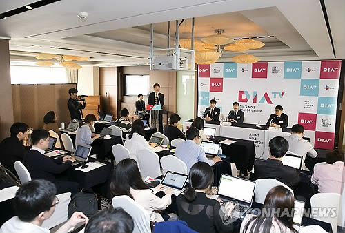 △ 'DIA(다이아) TV' 론칭 기자간담회 (서울=연합뉴스) 이덕재 CJ E&M 방송콘텐츠 부문 대표(가운데)와 관계자들이 7일 오전 서울 소공동 롯데호텔에서 새로운 사업모델 발굴, 플랫폼 확대, 글로벌 진출 등 3대 지원을 주요 내용으로 하는 'DIA(다이아) TV' 론칭 기자간담회를 하고 있다. 2015.5.7 << CJ E&M 제공 >> photo@yna.co.kr