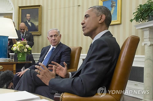 △ 지난해 10월 1일 미국 백악관에서 열린 미-이스라엘 정상회담 당시의 버락 오바마 대통령(오른쪽)과 베냐민 네타냐후 이스라엘 총리의 모습. EPA/MICHAEL REYNOLDS
