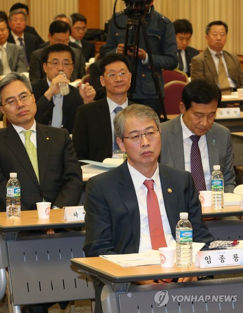 | △ 금융제도 개혁 정책심포지엄 (서울=연합뉴스) 서명곤 기자 = 8일 오전 서울 중구 명동 은행회관에서 열린 창조경제 활성화를 위한 금융제도 개혁 정책심포지엄에서 임종룡 금융위원장을 비롯한 참석자들이 이한구 창조경제활성화 특위 위원장의 기조연설을 경청하고 있다 2015.5.8 seephoto@yna.co.kr |