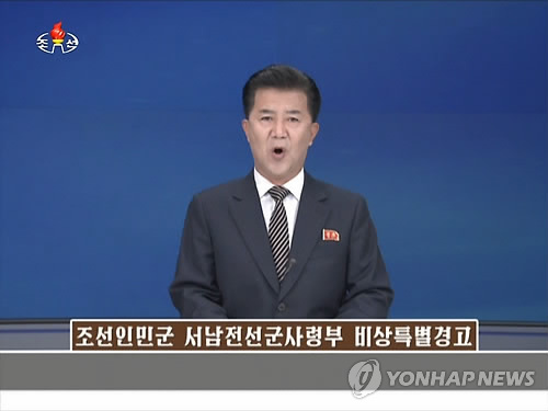 | △ 북한, 대남 '비상특별경고'발표…"영해침범 말라" (서울=연합뉴스) 북한 서남전선군사령부는 8일 '비상특별경고'를 통해 남측이 백령도 주변 서해 열점수역에서 해상분계선을 침범할 경우 예고 없이 직접 조준타격하겠다고 밝혔다고 조선중앙TV가 보도했다. 북한은 다만 남측의 침범해역을 구체적으로 밝히지 않아 경고에 언급된 '해상분계선'이 정전협정 이후 유엔군사령부가 설정한 북방한계선(NLL)을 의미하는 것인지, 북한이 2007년 12월 장성급회담에서 일방적으로 주장한 서해 경비계선을 지칭하는 것인지는 명확하지 않다. 2015.5.8 nkphoto@yna.co.kr |