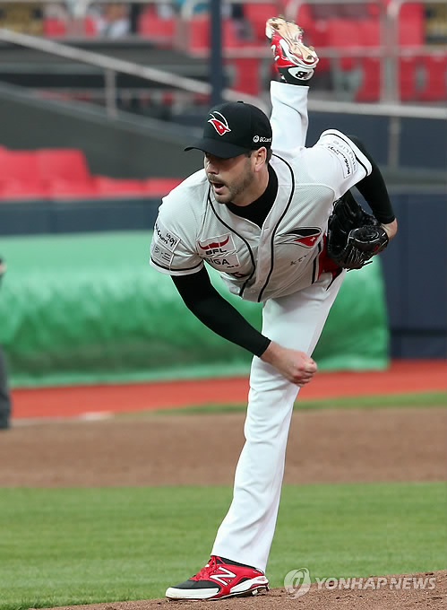 △ 역투하는 케이티 선발투수 어윈 (수원=연합뉴스) 신영근 기자 = 8일 경기도 수원케이티위즈파크에서 열린 프로야구 케이티 위즈와 LG 트윈스의 경기에서 케이티 선발투수 어윈이 역투하고 있다. 2015.5.8 drops@yna.co.kr