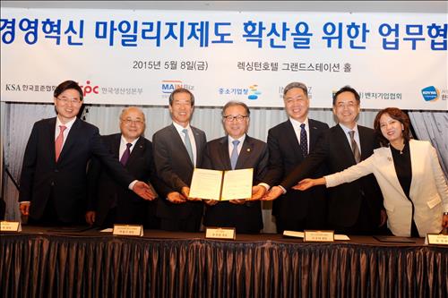 중소기업청은 경영혁신 마일리지 제도 확산을 위해 지난 8일 이노비즈협회, 벤처협회, 한국생산성본부, 표준협회 등과 업무협약을 체결했다.
