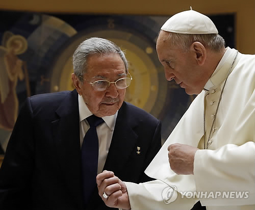 | △ 카스트로 쿠바 대통령, 교황 알현 (바티칸 AP=연합뉴스) 라울 카스트로 쿠바 대통령이 10일(현지시간) 이탈리아 로마의 교황청에서 프란치스코 교황을 알현하고 있다. 프란치스코 교황은 미국의 대 쿠바 제재 해제 및 양국 관계 개선에 핵심적인 역할을 한 것으로 알려졌다. kjw@yna.co.kr |