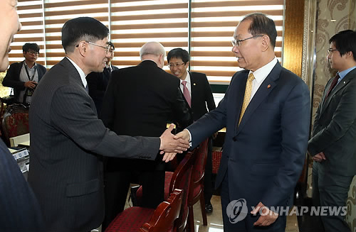△ 황우여, 대전·충남·세종지역 대학 총장 오찬간담회 (세종=연합뉴스) 배재만 기자 = 황우여 사회부총리 겸 교육부 장관이 11일 낮 정부세종청사 인근 한 음식점에서 구기헌 상명대 총장(왼쪽) 등 대전·충남·세종지역 대학 총장 23명과 오찬간담회를 하기 앞서 인사하고 있다. 2015.5.11 scoop@yna.co.kr
