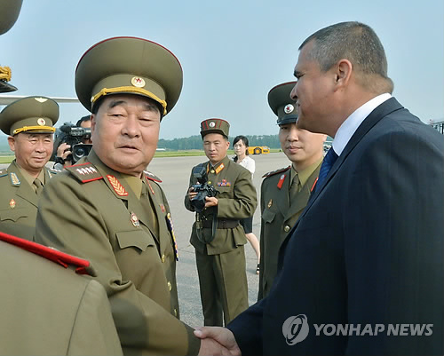 | △ '천안함 폭침 주역' 김격식 북한 육군대장. 2013년 6월 당시 김격식 군 총참모장이 쿠바로 출국하기에 앞서 평양주재 쿠바정부 관계자와 악수를 하고 있다. |
